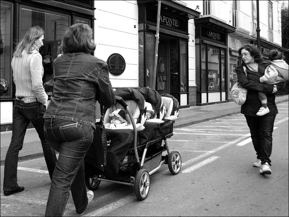 I soggetti sono ben disposti e le loro posture raccontano molto dell'immagine. Gli sguardi colti sono particolarmente efficaci: la signora con il bambino sembra fissare uno dei bambini sul passeggino.