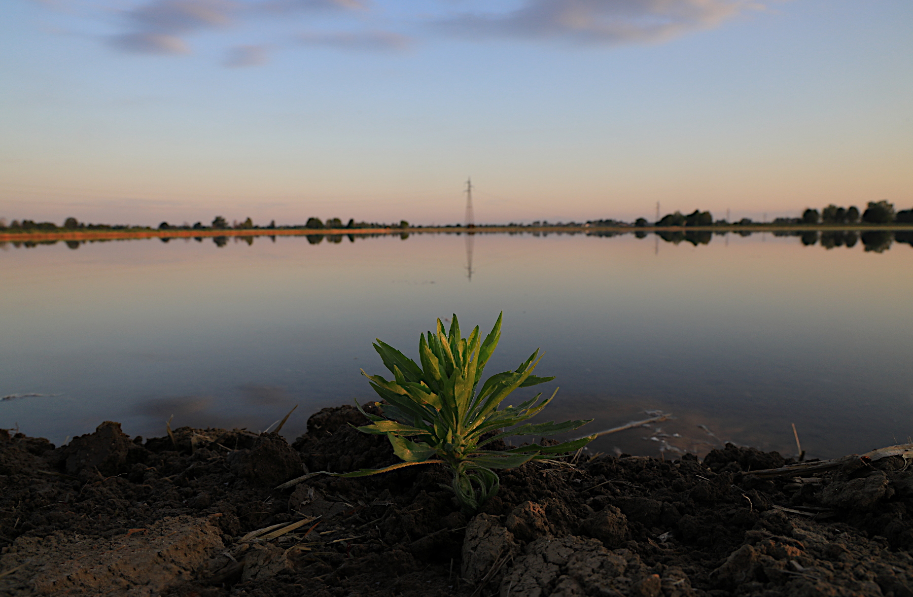 Piacevole e interessante il traliccio con il suo riflesso sull'acqua che bilancia la piantina in primo piano.