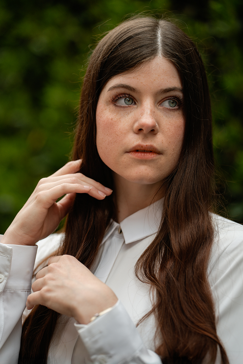 Morbida luce, sfondo sfocato ed uniforme, espressione dolce della modella, tutto bello
