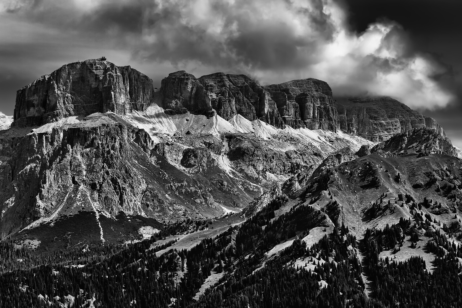 L'immagine è coerente con tante tue altre, con un bianconero curato e personale, che vuole quasi trattare le rocce quasi come enormi sculture. Anche questa visione mi piace molto: il luogo è famoso ed è famoso, perché è tremendamente bello. E sì: quel canalone ghiaioso, stretto e assai ripido, di Forcella Pordoi resta nella memoria di chi lo ha percorso almeno una volta, nel fragore dei massi che si muovono se ci si trova in discesa oppure nella fatica della progressione se lo si risale (anche se oggi c'è una traccia zigzagante che agevola). Un saluto, Francesco