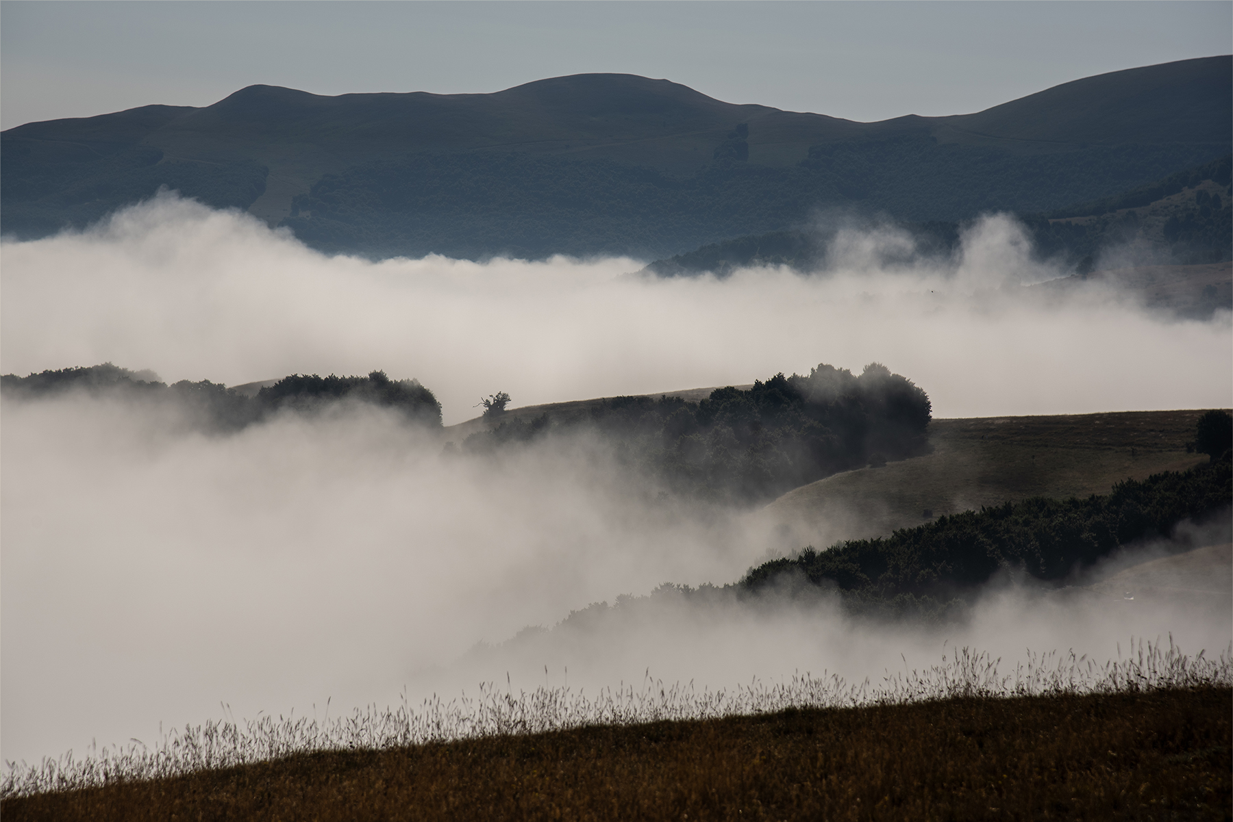 Non è certo la visione tipica di Castelluccio di Norcia, per come la conosco dalle innumerevoli immagini che ne vengono proposte. Questo si presenta un come un tipico paesaggio prealpino, per me abituale, con le nebbie-nuvole basse montanti nel corso del progredire della giornata.