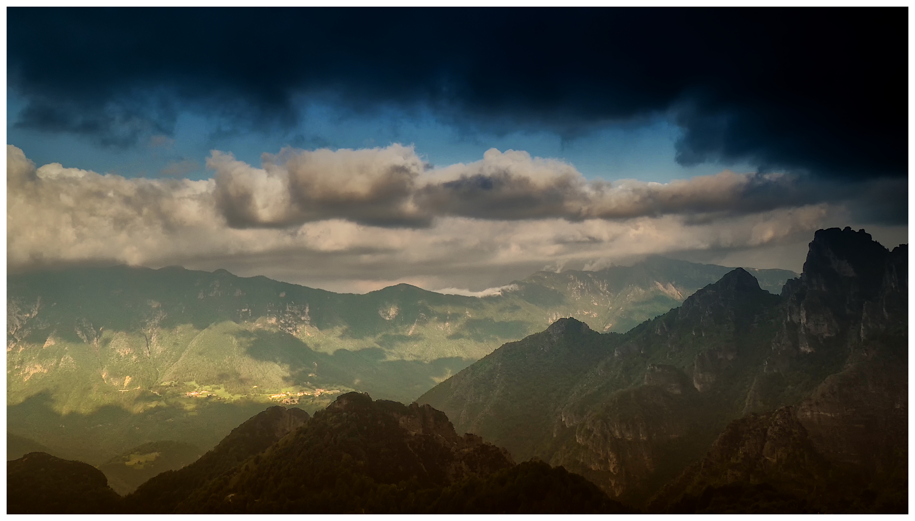 Il bei profili montuosi e il cielo plumbeo in primo piano sembrano fare da cornice al paesaggio sullo sfondo e alle articolate nuvole grigie e contribuiscono a dare profondità allo scatto.