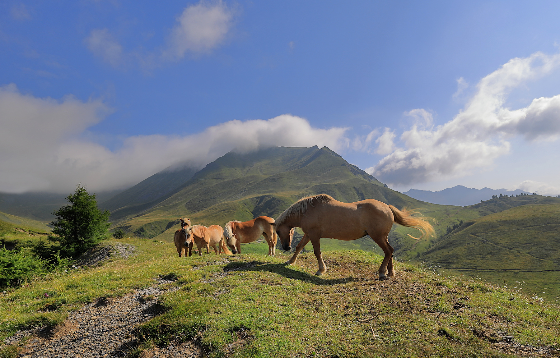 Che meraviglia .. già il luogo , con la sua ariosità , la morbidezza dei veli di nubi che solleticano le vette, quel verde che allontana la calura estiva, renderebbe la foto degna di nota, ma l'inserimento dei cavalli la rende speciale, suggestiva, con questa posa che sa di saluto e che non so dirti, mi trasmette un senso di rispetto .. Bella ,bella davvero  _________________
