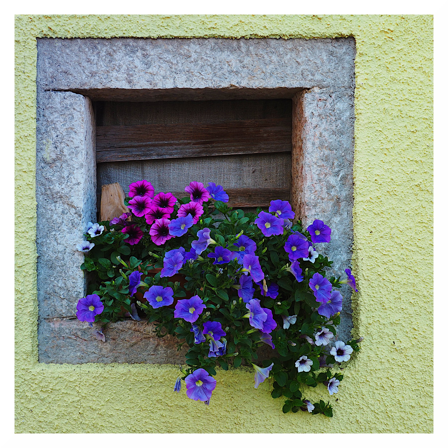 Una bella inquadratura floreale dove alla rigorosità delle geometrie della finestrella si contrappongono i colori, la gentilezza e la bellezza dei fiori.