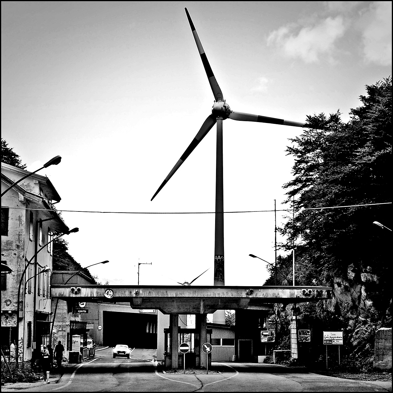 Colpisce una pala eolica inserita se pur in un valico tra case. ponti e traffico automobilistico. E già solo questo ne vale la foto.