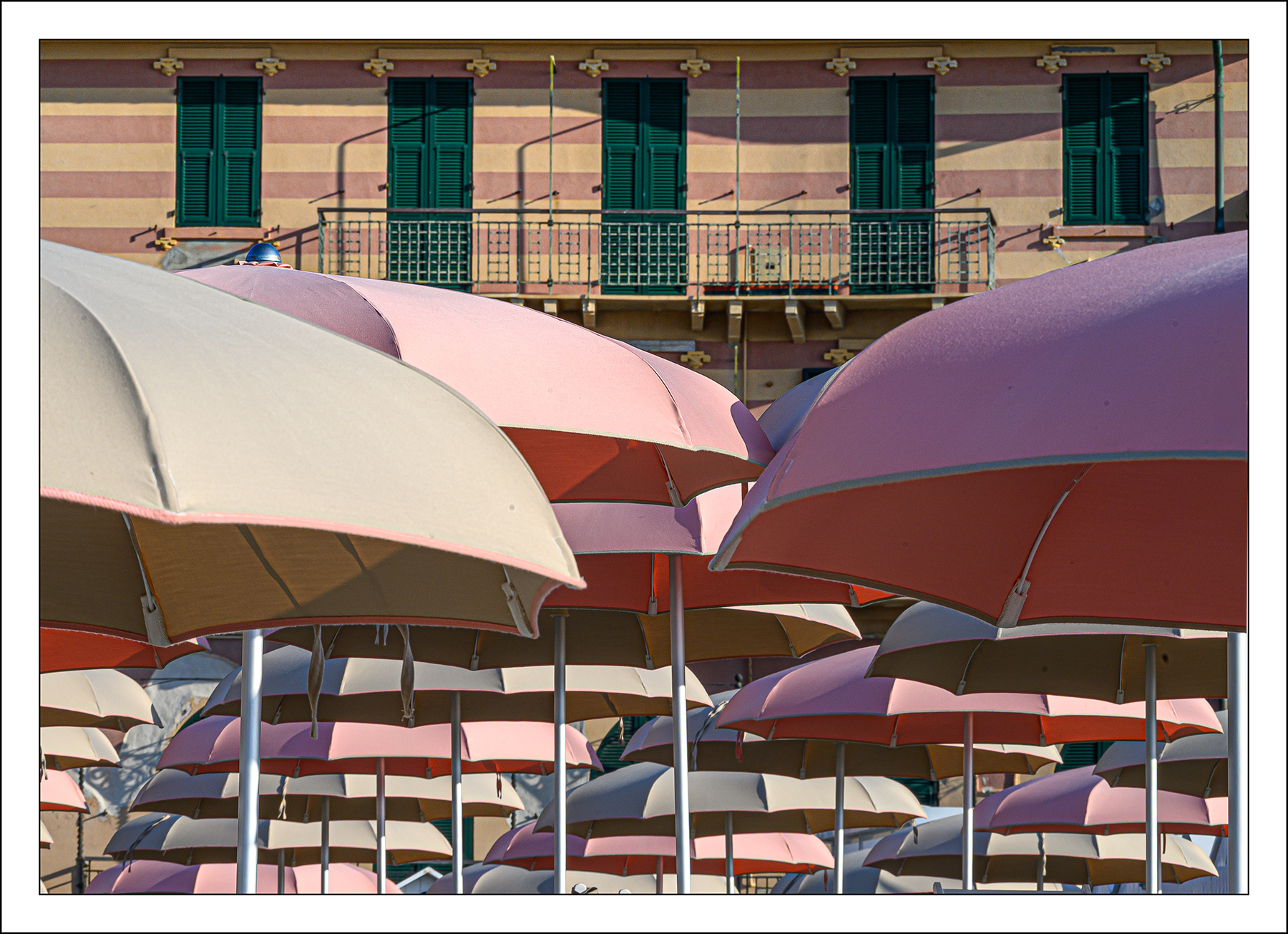 L’inquadratura centrale e simmetrica guida lo sguardo verso il muro, una luce naturale e bellissima esalta il contrasto tra l’antica parete e la fioritura di ombrelloni annullandolo in un armonico insieme di nuances. Tonalità tenui ed eleganti dialogano tra loro nell’abbraccio tra la stagione estiva ed il Borgo.