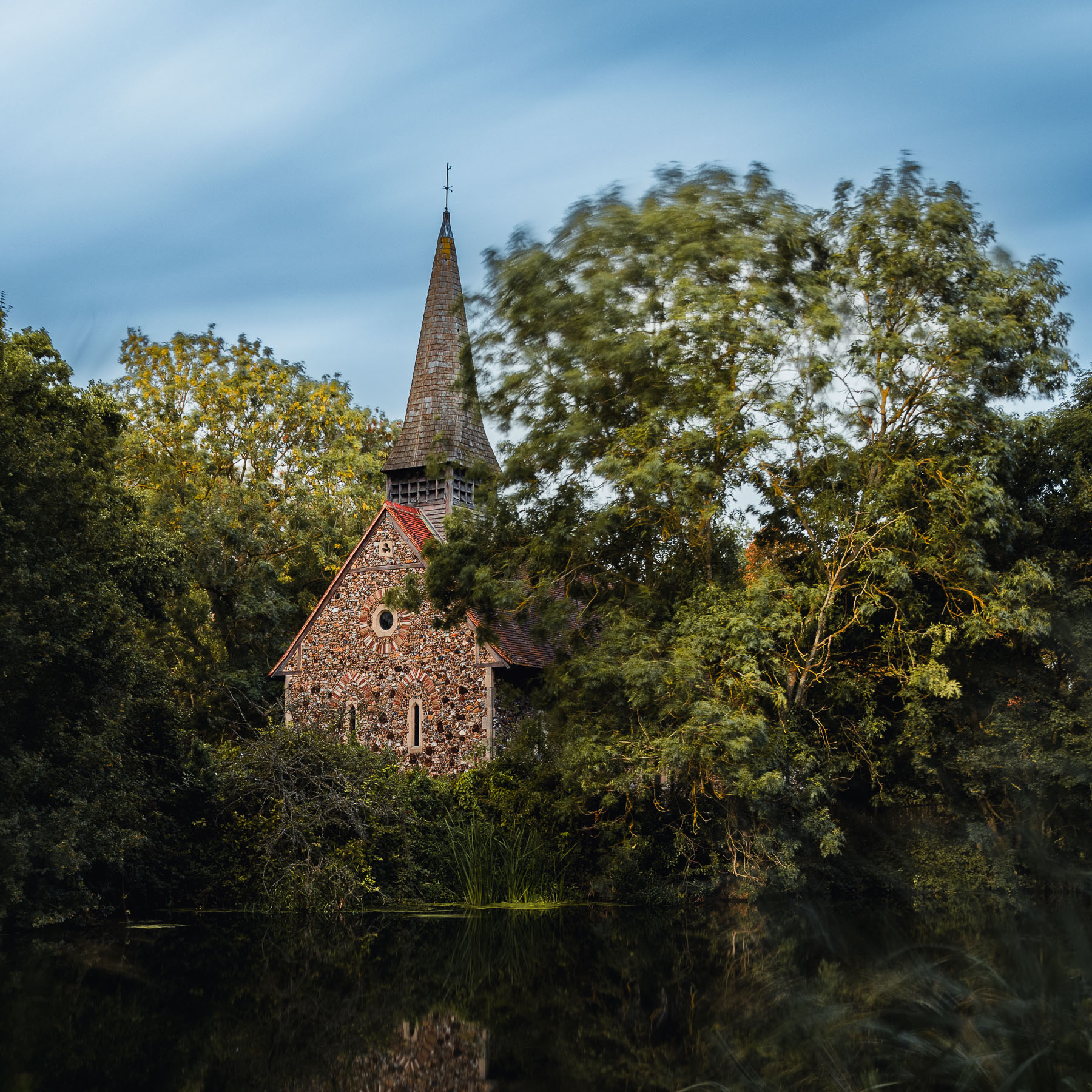 Suggestivo angolo della campagna inglese, con la bella chiesetta che sbuca tra gli alberi. Il mosso delle fronde da il senso di una giornata ventosa.