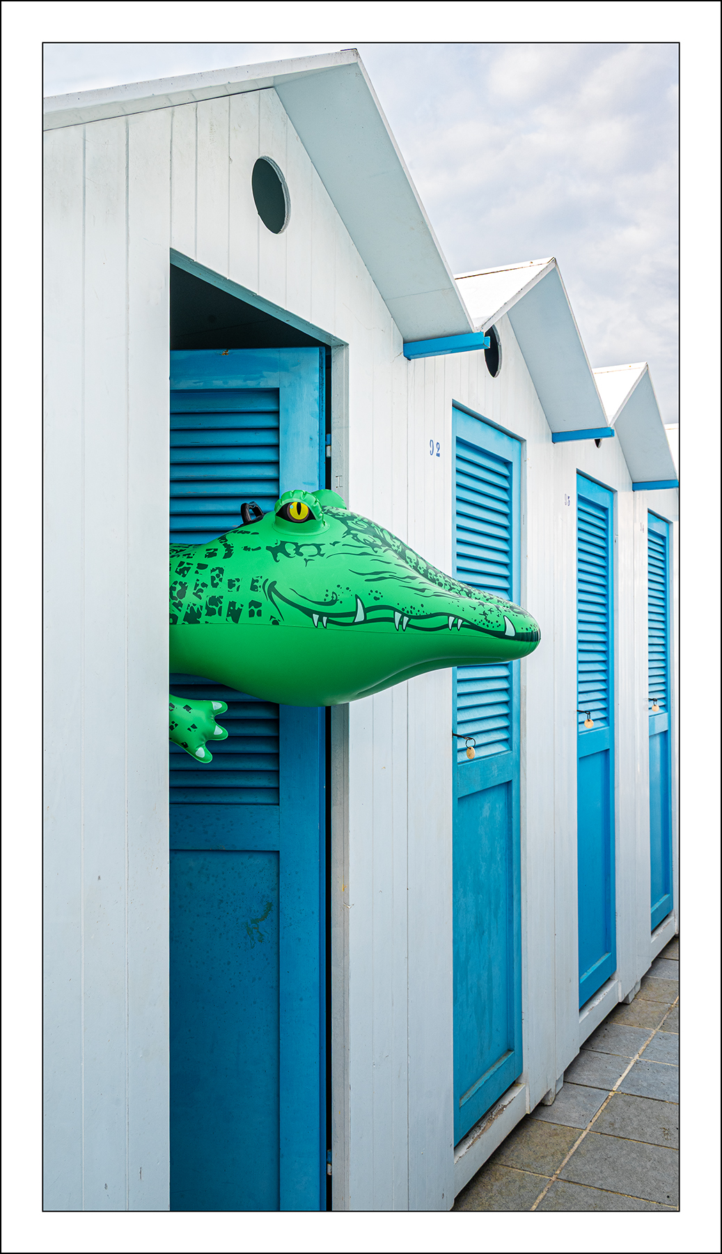 La presenza del coccodrillo è inaspettata e ironica, e contrasta in modo giocoso con l'ordinata normalità delle cabine. È un elemento di sorpresa e allegria, che trasforma una semplice scena di spiaggia in qualcosa di più curioso e divertente....talvolta anche i grandi tornano bambini