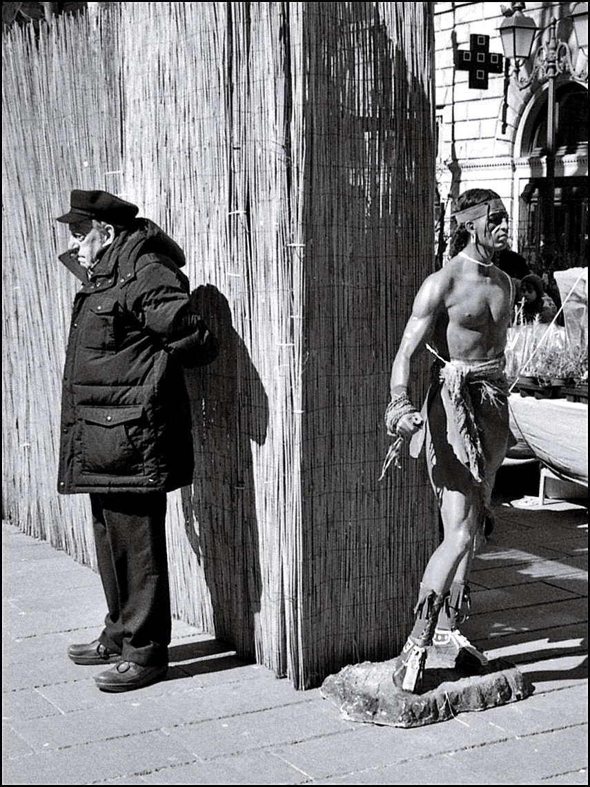 A me colpisce la posizione dell'uomo e della statua posti vicini uno all'altro ma che non comunicano tra di loro, sembrano due mondi distaccati.