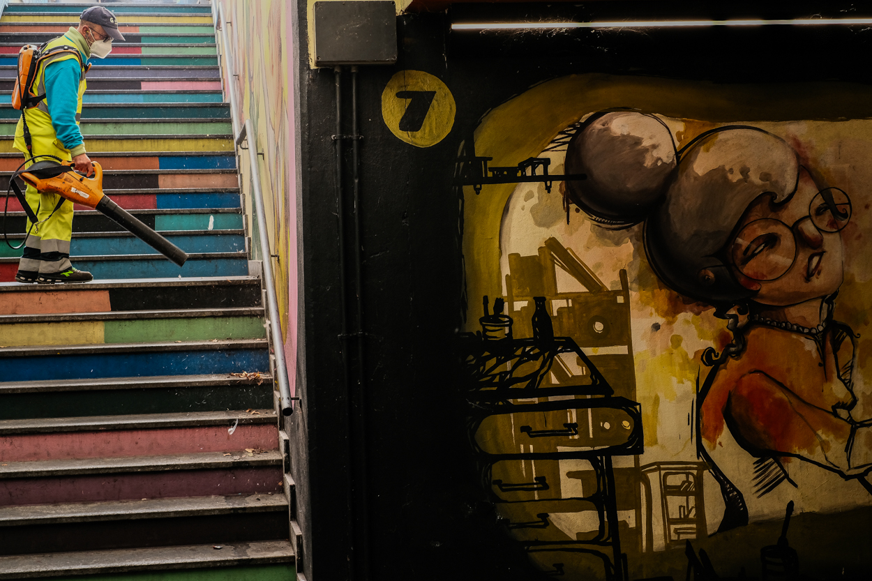 Purtroppo ero letteralmente spalle al muro, e con il solo 50mm eq a disposizione. Il rammarico è non aver avuto quantomeno il 35, che mi avrebbe permesso di includere la scala e la figura del murale per intero.