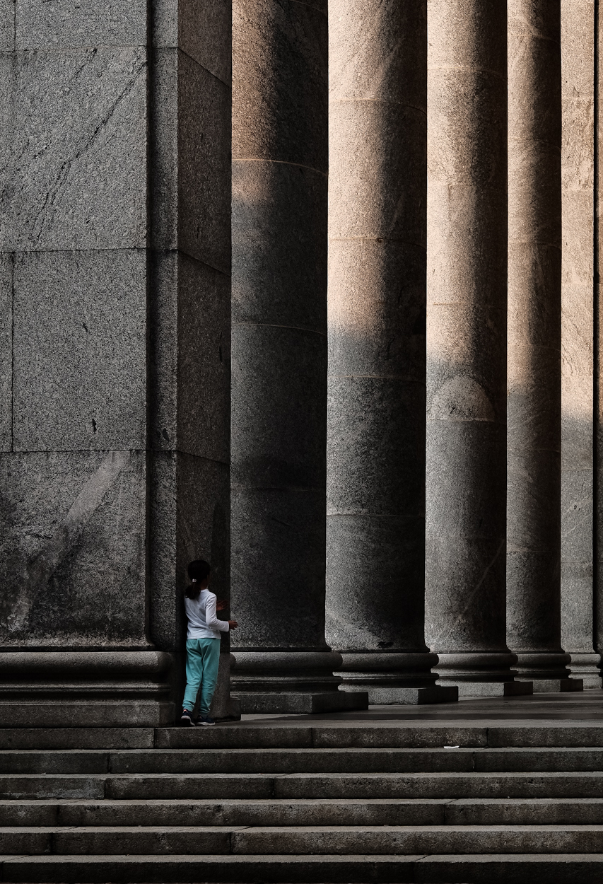 Un’architettura maestosa e severa a contrasto con la bimba colorata e quasi intimidita… Ottima immagine per composizione, contenuto e contrasti cromatici