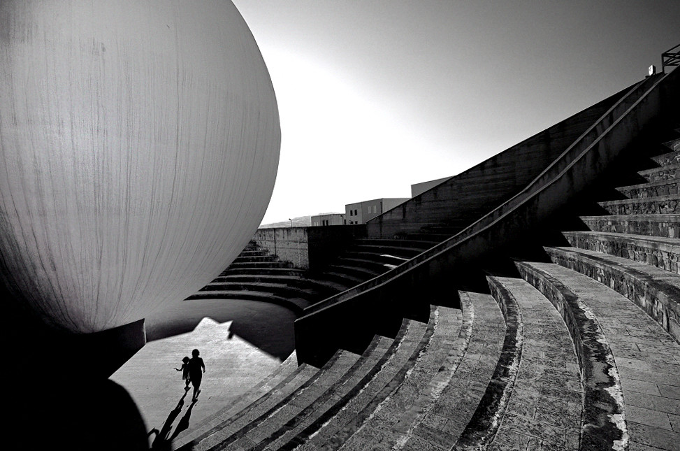 Molto interessante! Sono belle due figure con le loro ombre, il ritmo di scalinata e il pallone a sinistra parziale. Molto bilanciata! rende il bianco-nero.  |