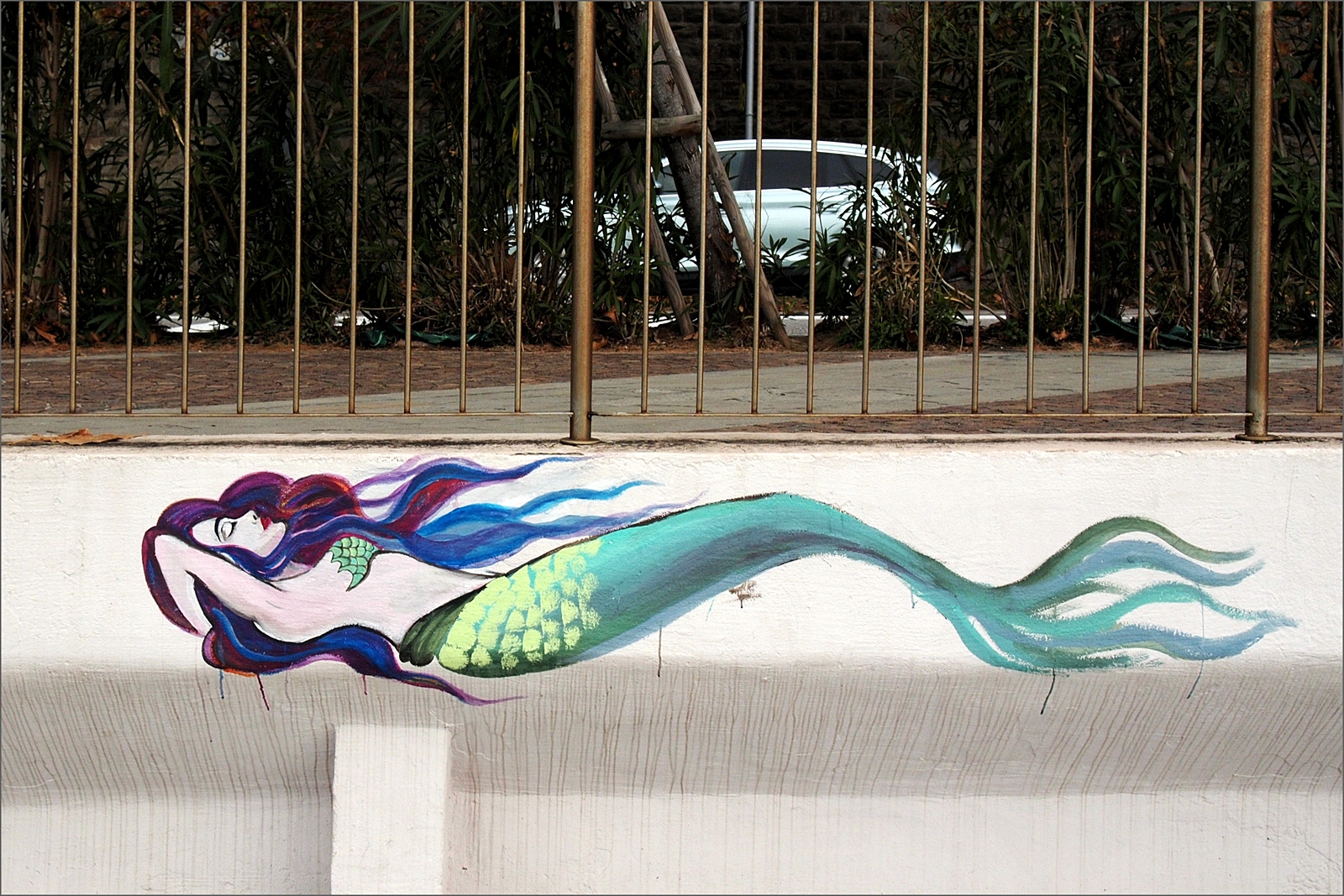 I colori del murales che dipingono una sirena è ben fatto e colpiscono visivamente divenendo i protagonisti.