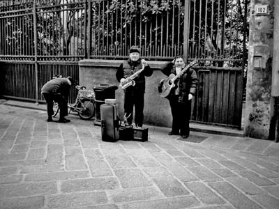 a me piace molto. sembra d'altri tempi, anche l'imbarazzo dei suonatori che si sentono osservati è bello. Mi piace anche che ci sia molto marciapiede a indicare la strada in cui vivono. Non so se tecnicamente è riuscita ma mi comunica molte cose e mi piace tanto.