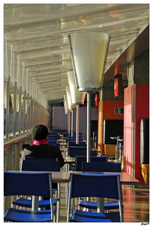 Una raddrizzatina in photoshop non ci starebbe male. Ma il pattern delle lampade e delle sedie è bello, rafforza l'idea della momentanea solitudine della signora. Bella anche la luce. Perchè non hai tentato di riprendere la signora di fronte ?