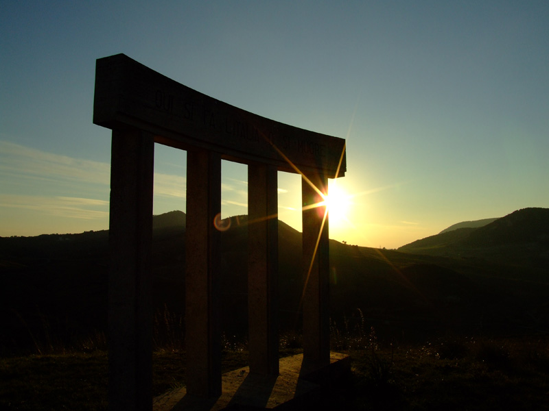 Colonnato in controluce dove è riportata la frase che disse Nino Bixio nella famosa battaglia di Calatafimi tra i Mille e le truppe borboniche situato nel colle di Pianto Romano a Calatafimi (TP)