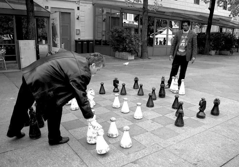 Quasi una street. Mi piace molto, bello l'uso del grandangolo, ottima la posizione dei due soggetti, quello a destra lo vedo molto pensieroso.. Direi un ottimo scatto valorizzato da un buon BN.