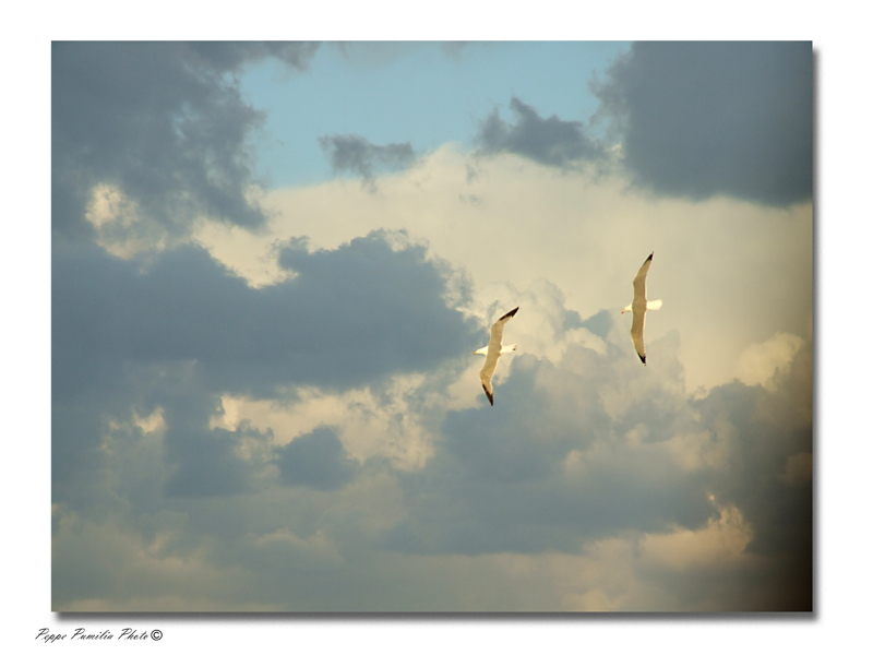 Molto bella, complimenti; sia per i gabbiani correttamente esposti, sia per il cielo che ha diverse sfumature nelle nuvole, con quel pezzo di azzurro che sbuca fuori e rende il tutto ancora più interessante.