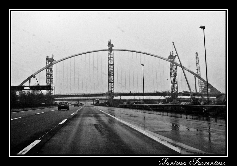 Bene le linee della strada che conducono al soggetto principale che però viene secondo me troppo disturbato da vari elementi (lampioni, gru, cartello autostrada a sx) e anche i grandi piloni verticali, che potrebbero fare da contrasto geometrico all' ampio arco del ponte, tolgono importanza al soggetto principale.