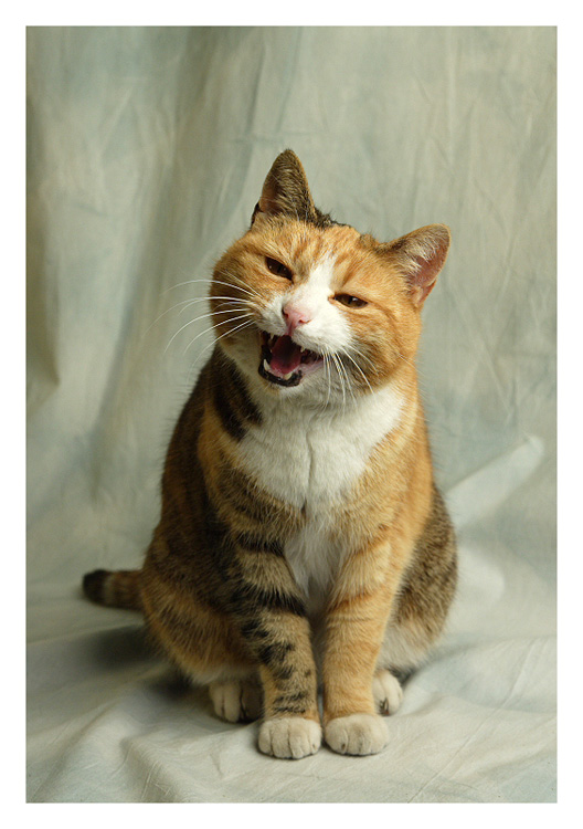 Mi piace l'illuminazione contrastata sul gatto. Non mi piace un gran che, invece, il lenzuolo come sfondo