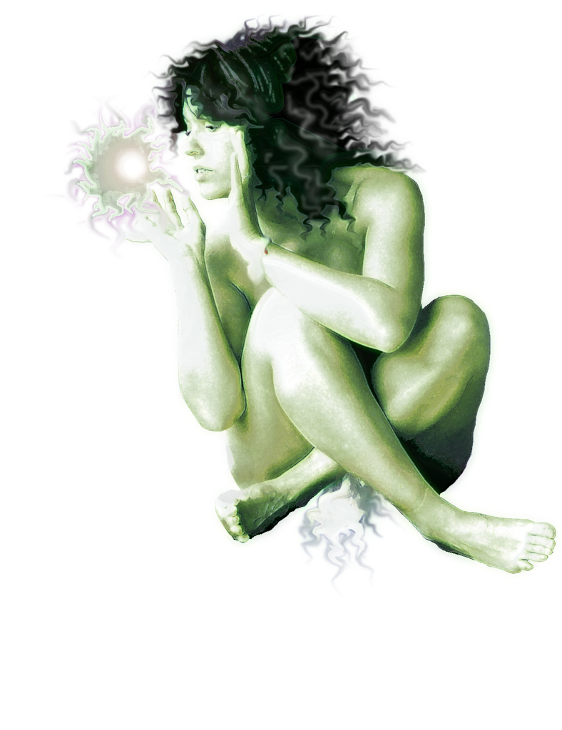 I capelli sono stati allungati e trattati con lo sfumino, la pelle é stata virata verso il verde con la correzione selettiva e le variazioni di colore, resa un po' più uniforme con lo strumento "involucro di plastica", e infine ho accentuato un po' i contorni, rendendoli più brillanti.