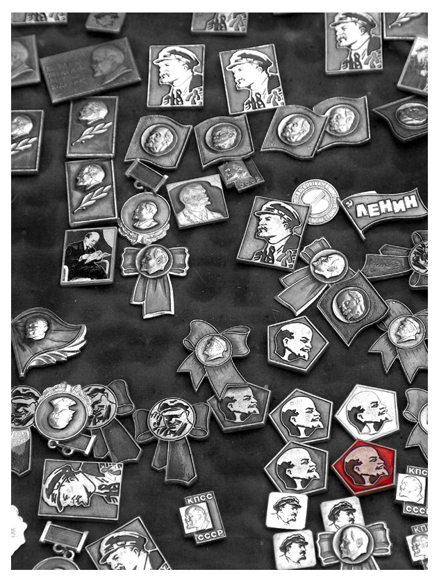Mi piace il tema leninista dominante, che così saturato nel messaggio quasi si annulla, e poi la spilla lasciata rossa che ravviva la composizione con un bel salto cromatico. Bella.