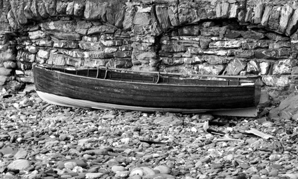 Una discreta composizione: tutto è ridotto all'essenziale, una piccola barca, il terreno di ciotoli e sassi, lo sfondo composto dai due archi di pietra. Il tutto valorizzato da un buon b&n. Mi piace..