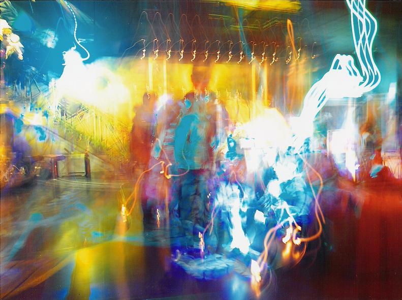Interessanti le presenze umane che si distribuiscono tra piani di illuminazione differenti, alcune semplici ombre, altre materializzate nella pura luce. Curiosi gli effetti grafici quasi pennellate di luce. Sicuramente una foto d'effetto. Si tratta di pose multiple o di posa B con light painting o che altro?