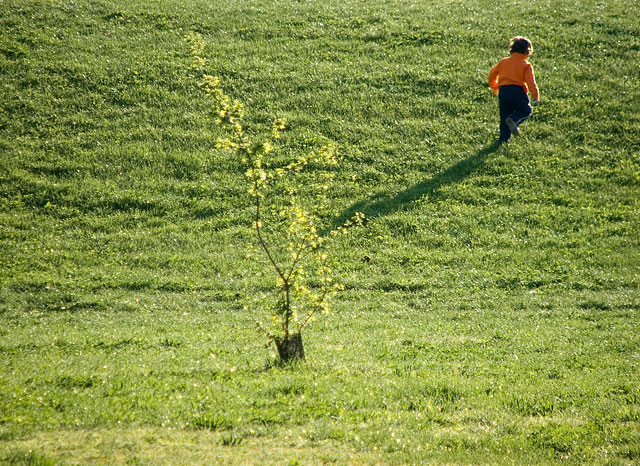 Il rosso ….di un bambino che corre verso una appetente salita con la sua ombra nera ( troppo impattante col verde..) senza capire dove si dirige e perché …lasciando una pianta senza Ombra |