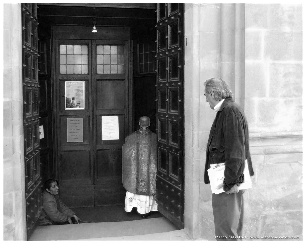 Bell'equilibrio tra il chiaro delle pareti esterne e lo scuro dell'entrata della chiesa, la composizione mi piace e dei piedi non i sente la mancanza.