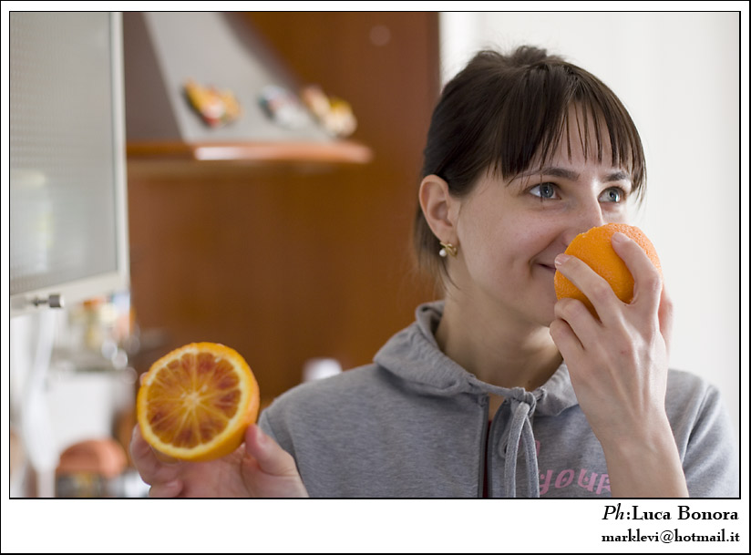 2- avrei invertito il gioco delle mani, la sua mano dx che porta l'arancia al naso e la sua mano sx che la mostra.