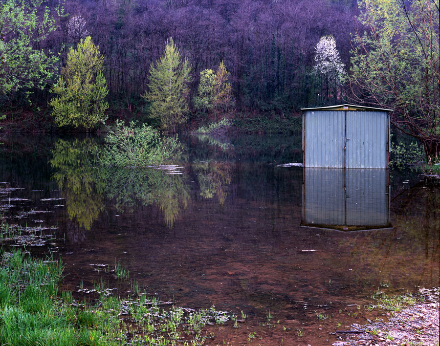 Lo sguardo viene portato a cercare i riflessi chiari del centro e poi a rimbalzare sugli altri colpi di luce tra gli alberi, rendendo il garage quasi un elemento di disturbo - nella composizione-.