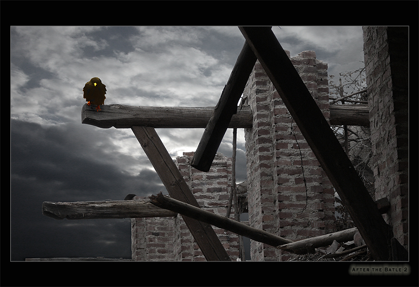 Il corvo non è finto ma ciò che lo fa sembrare tale è il ritocco, sicuramente eccessivo, che gli ho dato. Infatti essendo il becco e le zampe grigio scuro, per far si che il corvo non apparisse come una forma nera indistinta, ho ritoccato becco e zampe. Inoltre lo ho anche saturato per farlo risaltare sul resto della scena, affinchè cadesse l'attenzione su quell'uccello dall'aspetto austero e un pò tenebroso posatosi sulle rovine che sono sinonimo di distruzione.
