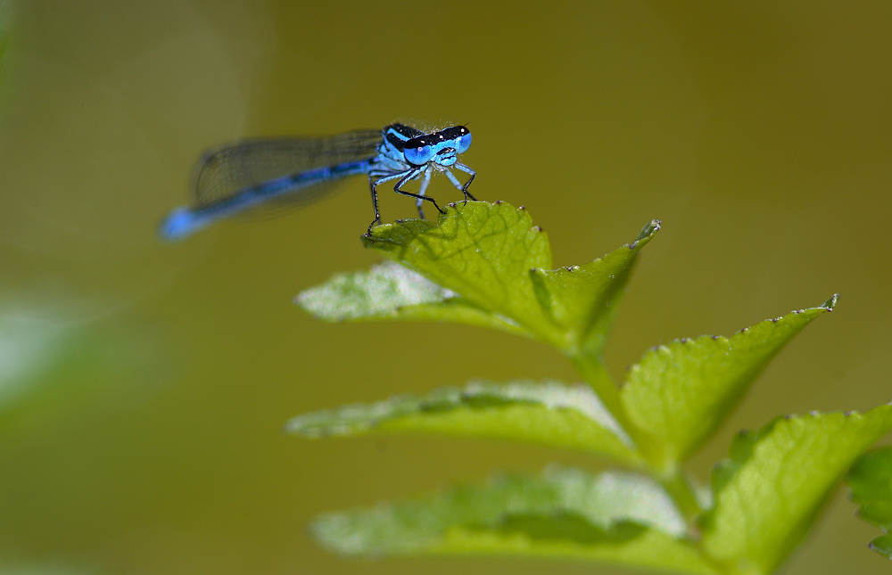 non so se è voluta, ma trovo giusta la decisione si sfuocare la parte posteriore della libellula che comunque è troppo lunga da rendere tutta, a vantaggio delle foglie, dando piu' tridimensionalità alla composizione.