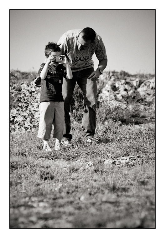all'inizio ti avrei detto "troppo terreno sfocato in basso.....taglia."....ma poi riflettendoci (perchè bisognerebbe rifletterci su prima di commentare) ho cambiato idea. Così com'è la foto mette in risalto l'aver spiato un tenero momento di intimità tra padre e figlio che sicuramente trovo piacevole.Quindi nulla da dire.