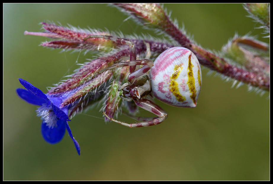 è un meraviglioso ragno tomiside, o ragno granchio... si tratta di animali che non costruiscono tele eclatanti ma che si mimetizzano sui fiori per catturare gli insetti impollinatori. spesso possono cambiare colore. !