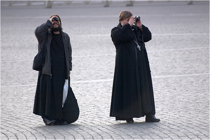 Mah, secondo me lo scatto è ottimo così. Ne spiego il motivo. Non includere nulla dà a me più un senso di "vastità", di essere sperduti. E' come se, in qualche modo, la vastità della piazza li facesse assomigliare a due in mezzo al deserto. Mentre porre un altro elemento che in qualche modo fa da punto di riferimento (un oggetto a cui arrivare, una sorta di "oasi"), gli darebbe un'ancora di salvataggio.