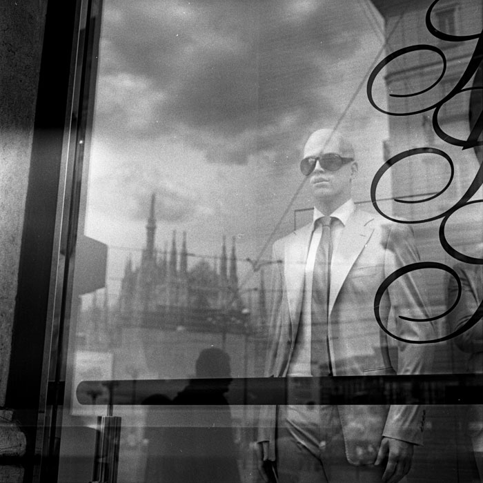mi piace il riflesso dell duomo(credo sia quello ) sulla vetrina e l'opposizione tra l'uomo di passaggio e il manichino..