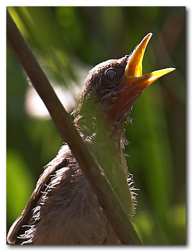 se ne stava rannicchiato in controluce,posato su una cannella posta sulla battigia del lago..ogni tanto si allungava e spalancava il becco con un raggio di sole che glielo illuminava..versi non ne faceva e non so' se ne voleva fare...forse era solo affamato e aspettava l'imbeccata...sara' un piccolo cannareccione?
