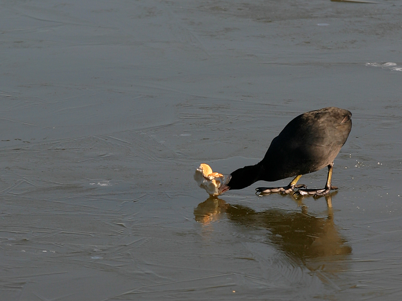 per scattare qualche immagine, il fotografo attirò le folaghe con un panino, vicino al capanno, non pensando alle conseguenze che avrebbe creato sulla tranquilla comunità delle folaghe