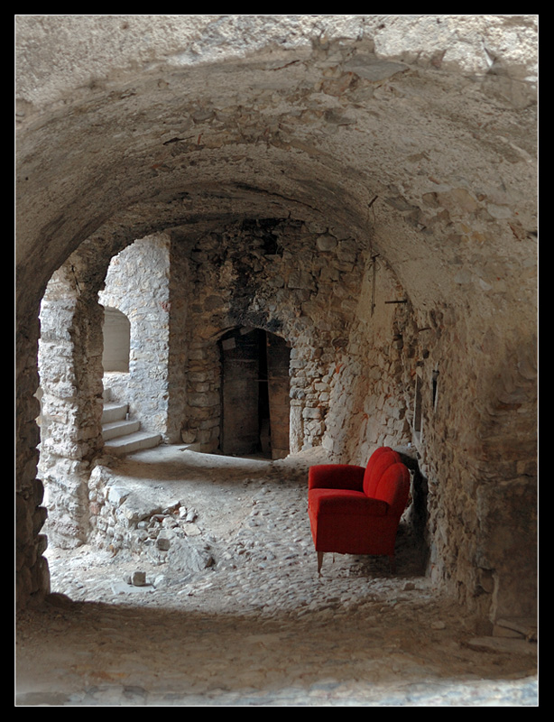 | Borgo Medioevale di Canale di Tenno. Piccolo scorcio. Questo divano rosso mi ha fatto impazzire. Ero indecisa se fotografarlo con o senza presenza umana.. alla fino ho preferito il contrasto ... tra il grigiore e l'antico che si respira nel borgo.. e questo divano.