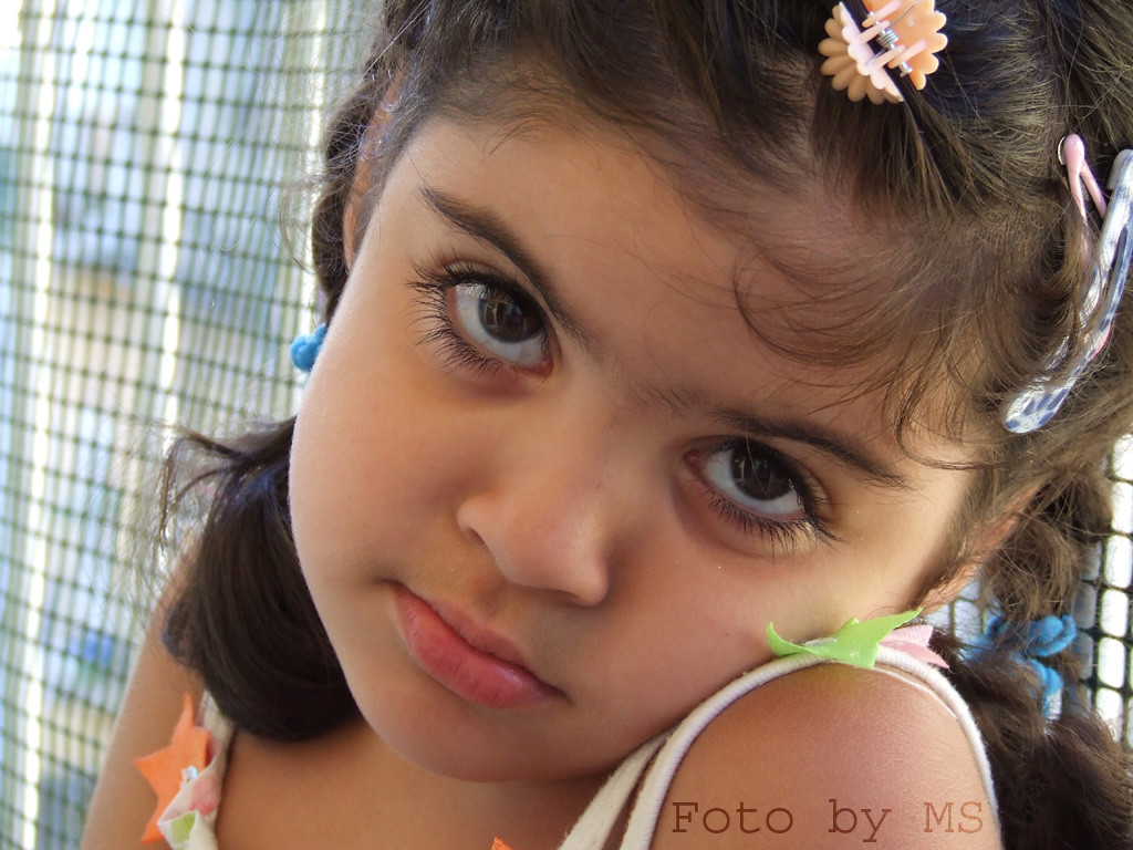 | tenera! bella espressione hai saputo cogliere...mi dà un pò fastidio lo sfondo e le varie mollette nei capelli...sarebbe anche da passare in bn...che ne dici? |