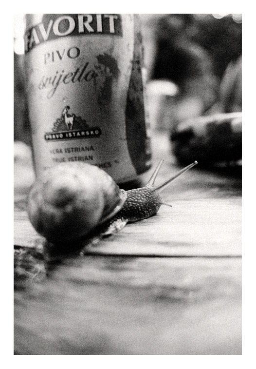 Mi sembra che il musetto della lumaca sia perfettamente a fuoco. Un'altra cosa che mi piace di questa foto, a parte il bel b&n, è il fatto che è tutto storto, molto confusiva come composizione, ma funziona alla grande!