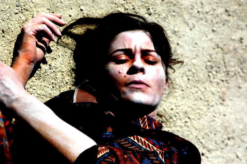 una fotografia di scena? colori forti, luce di mezzogiorno, un viso stanco e sfinito, reduce da una dura battaglia... le ombre nette che disegnano il viso, le mani, il contatto col terreno. una ciociara moderna... solo... il fuoco trae in inganno, cade sul vestito altezza omero, rende il viso sfocato e non leggibile...