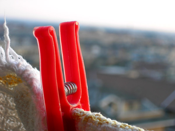 In un primo momento stavo per dirti che è sempre meglio la classica molletta in legno ! Pensandoci invece mi piace questa bella plasticosa rossa si addice di + a quello che si intravede della città.