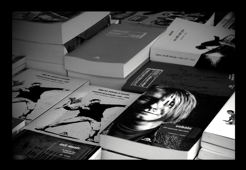 E, casuali o no, sia il libro 'oggi ho salvato il mondo' che per altri versi 'exit music', come il tizio che si affaccia dal libro rimasto fuori dall'inquadratura proprio per entrare anche lui nella foto, sono tutti elementi che compongono la foto e per me connessi con il 'mio' soggetto. Elementi che sono importanti e che raccontano il luogo nel quale ho scattato la foto. Certamente non lafeltrinelli (niente contro ma...).