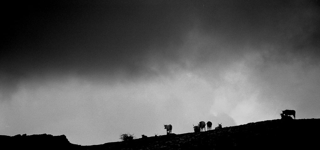 Il soggetto voleva essere sia le mucche, che l'ambientazione. Si stava avvicinando un bel temporale estivo e mi piacevano le sagome delle mucche in lontanaza. Ho esposto per le nuvole più luminose proprio per tentare di otenere solo piccole silhouette. Inoltre volevo avere il fotogramma diviso in tre parti: quella superiore ed inferiore scure e quella centrale più chiara. Il tutto a Guadagnolo (RM) posto incantevole ad un passo da roma che vi consiglio di andare a vedere!