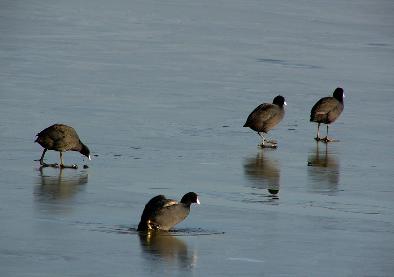 siamo arrivati alla fine del fotodramma -- le folaghine sconfitte abbandonano il campo dopo la giusta batosta. Mestamente la folaga cattiva raduna le sorelle e le conduce verso altri luoghi, mentre il ghiaccio comincia a disciogliersi sulla valle ai primi raggi di un pallido sole primaverile……..