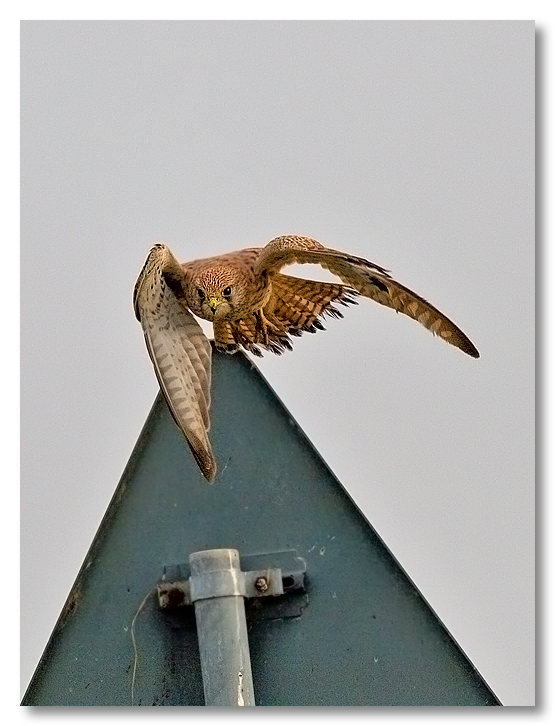 Sì, è proprio un gheppio (femmina), purtroppo il cartello stradale non piace nemmeno a me , ma spesso i gheppi scelgono posatoi "poco naturali" tipo tralicci o pali della luce...