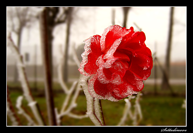 Stamattina arrivo al lavoro e la nebbia, il vento e soprattutto il freddo avevano ridotto così questa rosa.